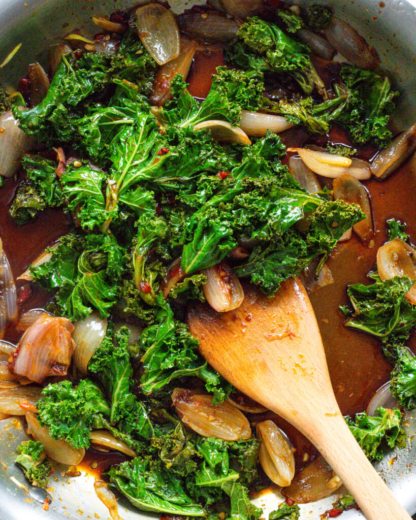- Add in the kale and coat it in the balsamic, mix everything in the sauté pan together. Cook another 1-2 minutes, letting the kale wilt but not brown.