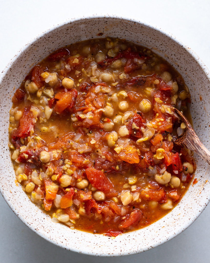 - Pour the chickpeas directly into the bowl with tomato mixture. Stir to combine.