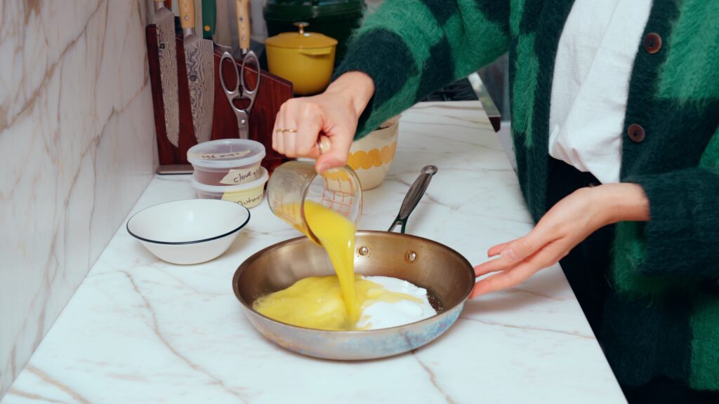 - Add the sugar and orange juice to a shallow sauté pan or skillet. Mix to combine.