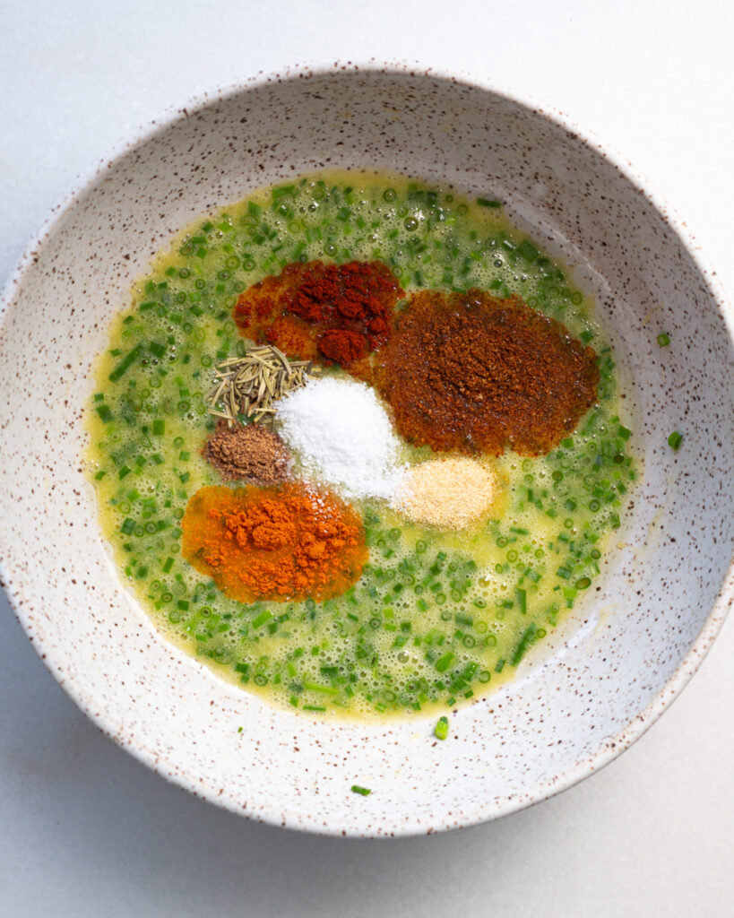 Then, in a medium bowl whisk together the second egg with the oil and milk. Add in the flour, cornmeal, baking powder, salt, and spices. Mix until you have a thick batter, then fold in the chives.
