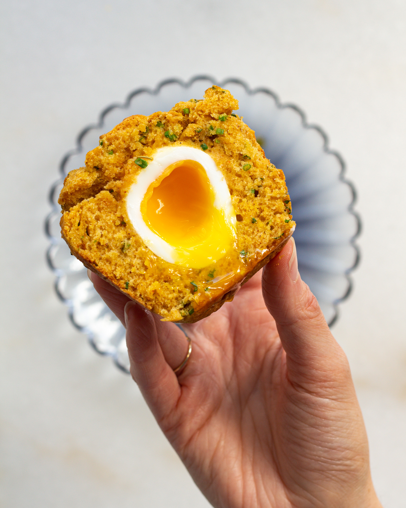 This is my big secret (and did I cry over many under-boiled eggs while testing this recipe? Yes. Yes I did). But you don’t have to boil your eggs for an insanely low amount of time. 5-6 minutes is perfect, with 6 being my sweet spot! This is because as the egg is nestled in the batter, it is protected from the heat of the oven. So even if you’re making only one, the egg still won’t overcook. You just want it to start as jammy as possible, and then hopefully it will stay that way!