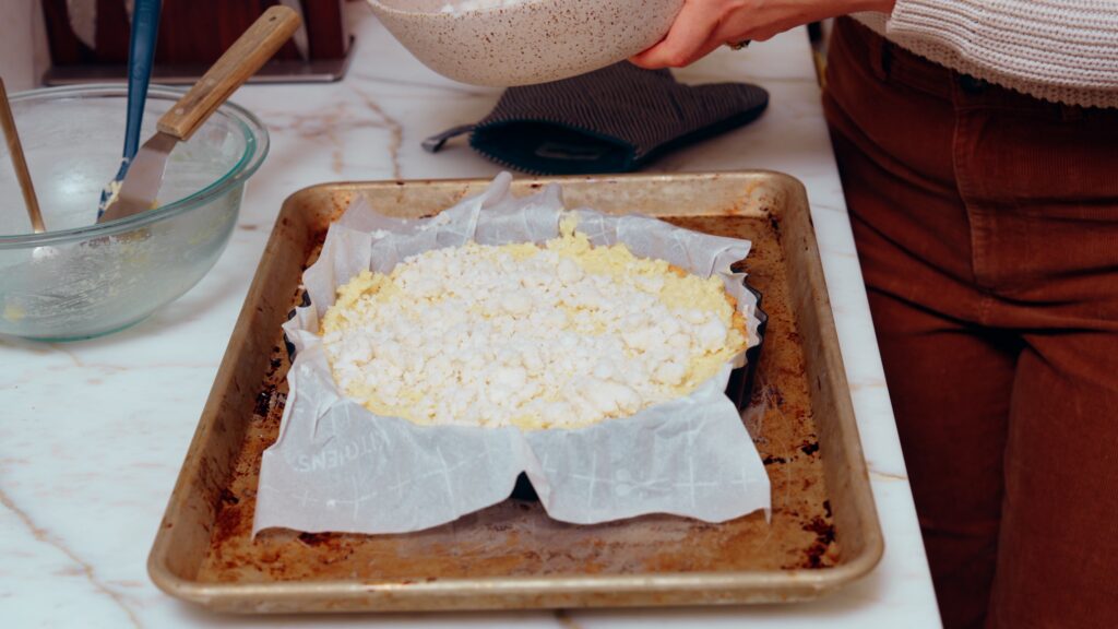 - To the par-baked crust, add the coconut filing and spread it to the edges, then scatter the crumble on top.