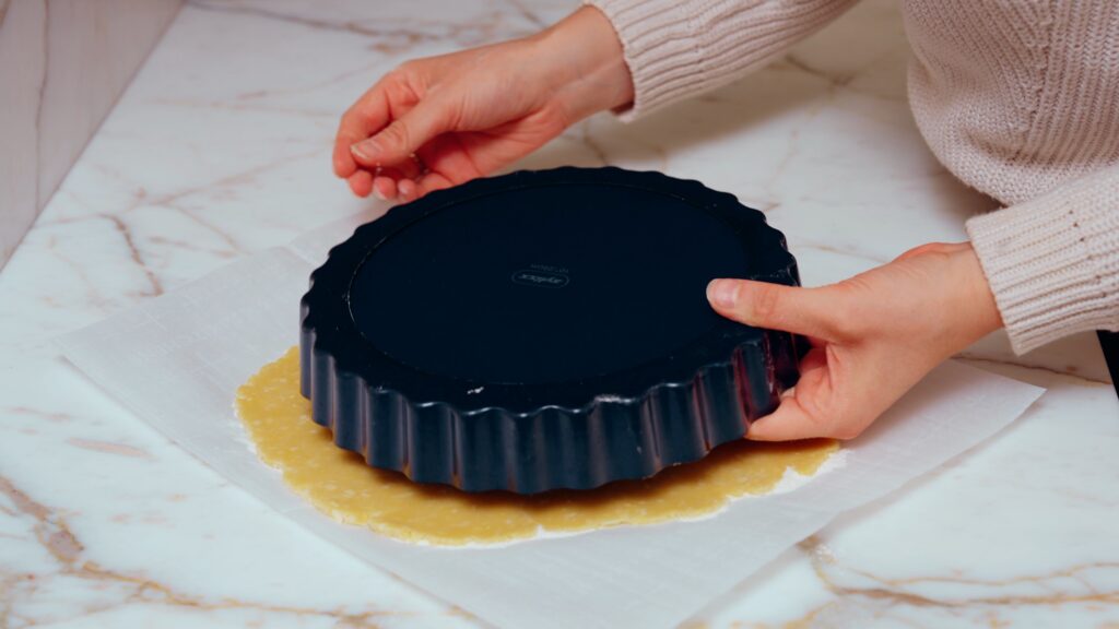 This can make rolling it out extremely frustrating, especially when lifting it into the pan. To fix this, I suggest rolling the crust out directly on a sheet of parchment paper. You see me in the image below measuring if my crust is wide enough. It should overhang the tart pan by at least a centimeter.