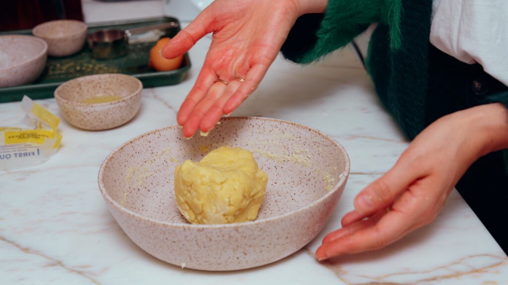 - For the crust, use a hand mixer to mix together 113 grams softened salted butter, 50 grams granulated sugar and 15 grams of shredded coconut. Mix until fluffy, then add 140 grams of flour and 1/2 teaspoon salt. Mix in the flour and salt until shaggy, then add the egg yolk and mix until a tacky dough forms (this may take a few minutes, but it will get to a play-doh like texture after a bit).