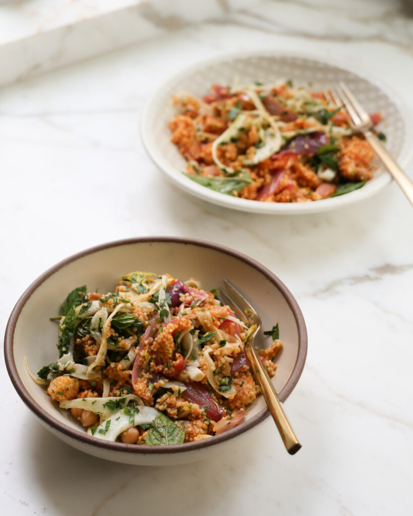 Tabbouleh is traditionally made of bulgur wheat, herbs, olive oil and lemon juice, but its recipe can vary widely. While this dinner is truthfully a couscous salad, it was initially inspired by tabbouleh and my experience with different versions of that dish. It only felt right I credit that original recipe in this blog post (and to pay respect to the inspiration!). I always aim to properly attribute where my recipe ideas come from, and how they evolve!