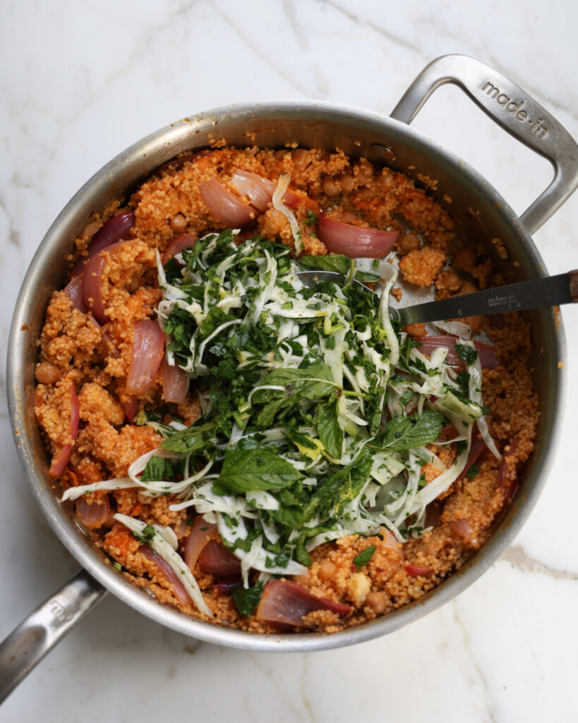 The main difference between this dish and traditional tabbouleh is that there are apricots and red onion cooked down before they are added to the salad, the amount of parsley is on the lighter side, and lime juice is used as the main acid, not lemon. I opted to use couscous instead of bulgur wheat because it’s more readily accessible in the grocery stores in the US.