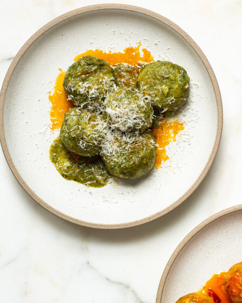 This gnudi is so rich that I recommend sauces with a bit of heat to them, like a spicy tomato sauce. However, if you like rich, buttery pastas, a standard pesto, or a brown butter sage sauce are also lovely with this!
