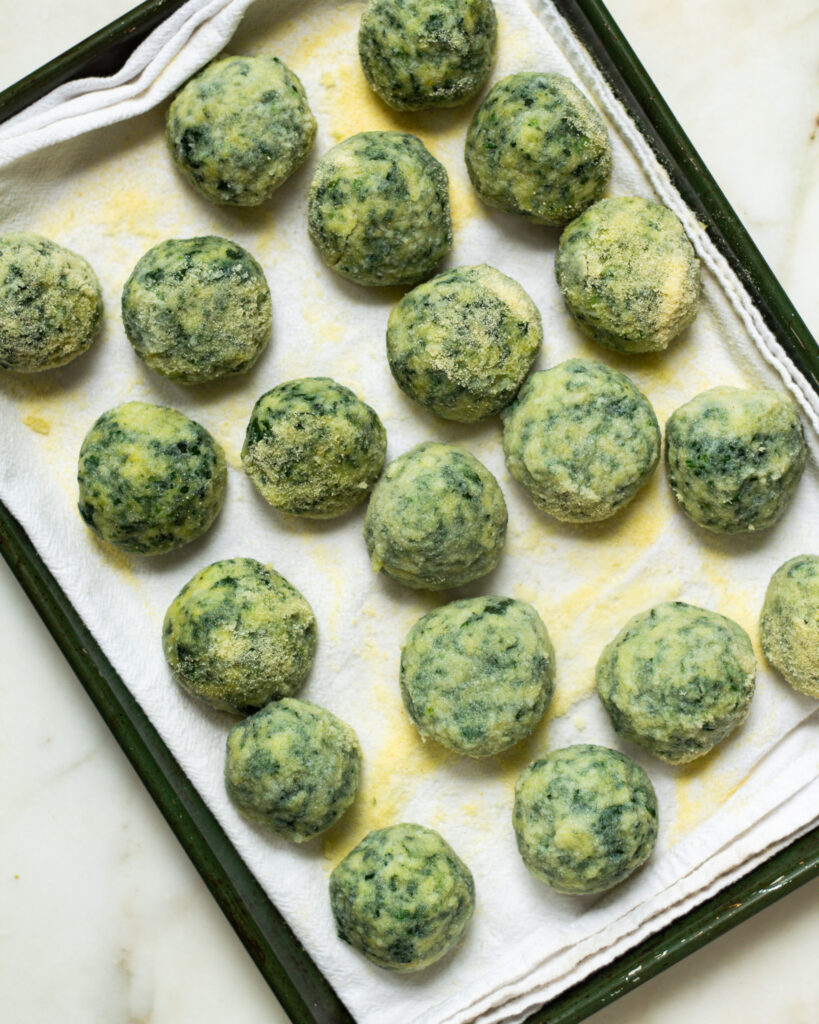 If your test gnudi does fall apart, dust all your gnudi with a heavy dusting of semolina flour. Roll them into balls again, as tight as you can, and let them chill in the fridge for another hour, but ideally 4 more hours so that they are fully set.