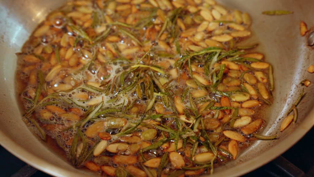 - In a small sauté pan over medium heat, add 2 tablespoons of salted butter, the leaves from 3-4 rosemary sprigs, and 1/3 cup pumpkin seeds. Let the butter melt, season with 1/2 teaspoon of salt and stir often, allow the seeds to toast and the rosemary to fry until it is curling up and crisp. The butter will be slightly brown. Turn off the heat.