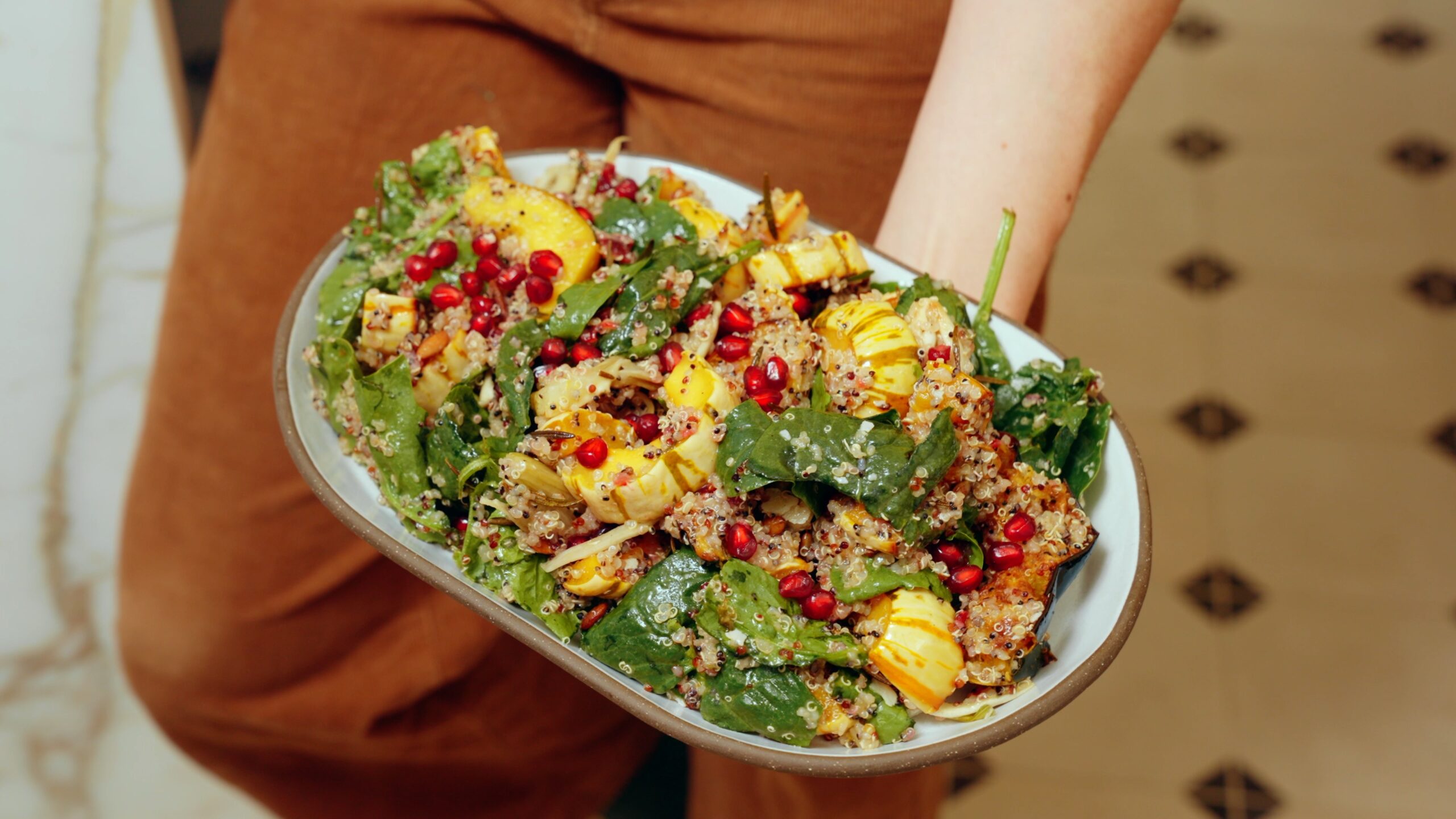 - Pile the spinach on top. Shave on 2 ounces of parmesan, then sprinkle in the seeds from a pomegranate, reserving some seeds for the topping. Toss everything together until well combined. Taste and season as preferred.