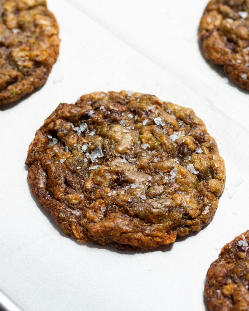 These were delicious! The nuttiness of the brown butter/toasted oats complements the zucchini and dark chocolate really well. I substituted gluten free flour, but they still spread out and caramelized nicely while baking.