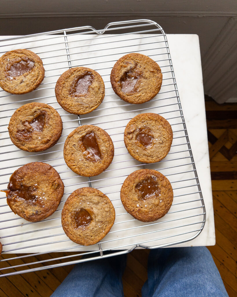 — if you like salty sweet things like me, add an extra 1/4 teaspoon or so of salt to the cookie dough while mixing, and top with flaky sea salt while you’re putting the toffee in the dead center of each cookie!