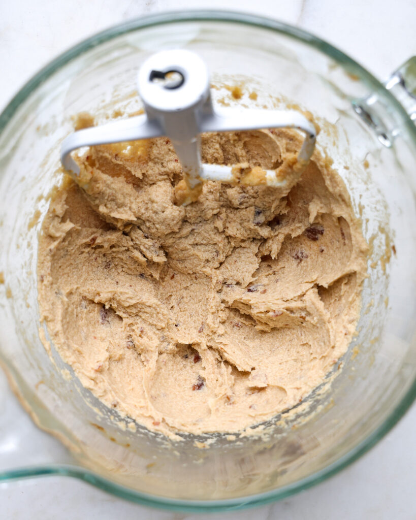 - Using the paddle attachment or an electric hand mixer, mix the dates and water together until you have a paste, 2-3 minutes. It's okay if it is a bit chunky. Add in 1 cup (226g) of softened butter and mix again until the dates and butter are combined. Add 1 cup (200g) granulated sugar, 1/2 cup and 1 tablespoon (110g) brown sugar and 2 teaspoons vanilla extract and beat on medium speed until the mixture is fluffy.