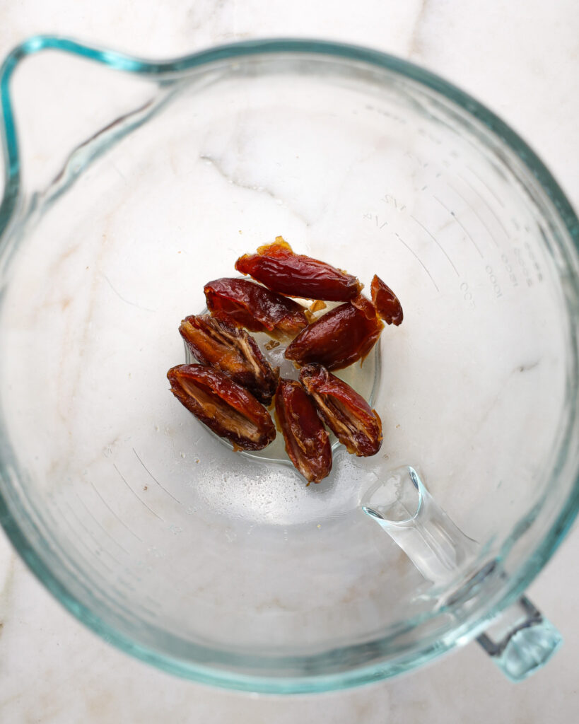 - Next, make the dough. Add 150g of dates to the bowl of a stand mixer, or to the large bowl you plan to mix your dough in. Pour over 1/3 cup (80g) boiling water. Press the dates down into the water, they won't completely submerge but this will help soften them a bit.