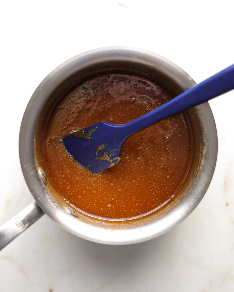 - Begin with the toffee. Add 1/4 cup (57g) butter, 2 tablespoons (25g) sugar, 1/4 cup (55g) brown sugar, 2 tablespoons (21g) honey and 1/4 teaspoon kosher salt to a small pot. Set this over medium heat and bring to a simmer. Let this mixture simmer for 4 minutes. If you have a thermometer, use it to monitor the temperature and aim to get it between 280°F-290°F, but make sure it doesn't go above 300°F.