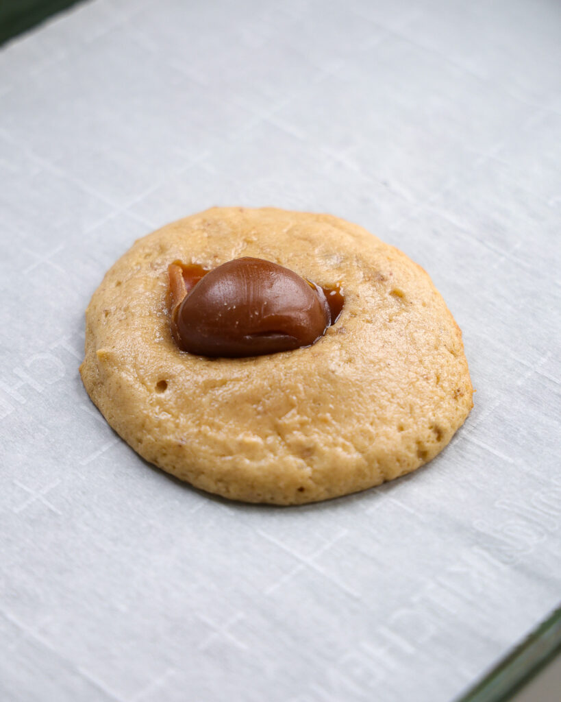 - Be sure not to press it down through the dough. It will sink naturally, but pressing it down might cause it to break through the cookie and be a bit of a mess.