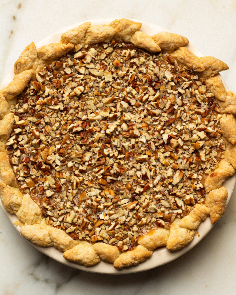 Now, I will say, this is a very holiday-energy pie. Meaning: it is a labor of love. But WOW does that labor deliver. You’ll need a few bits of equipment, but you can always side-step a few things by adding a store-bought pie crust, or prepping the sticky toffee batter or pumpkin batter ahead of time. Both keep pretty well.