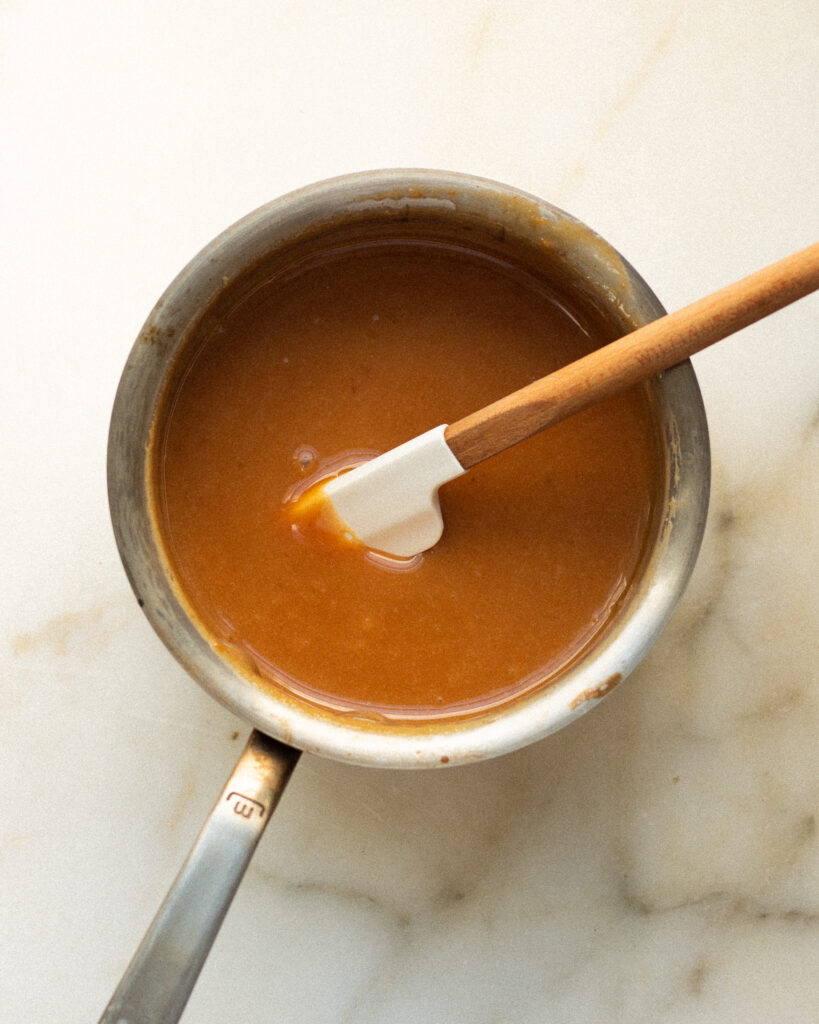 - Place this back over medium-low heat and whisk until it reaches 220°F, then set aside. Feel free to reheat it over low heat to make it pourable again when needed.
