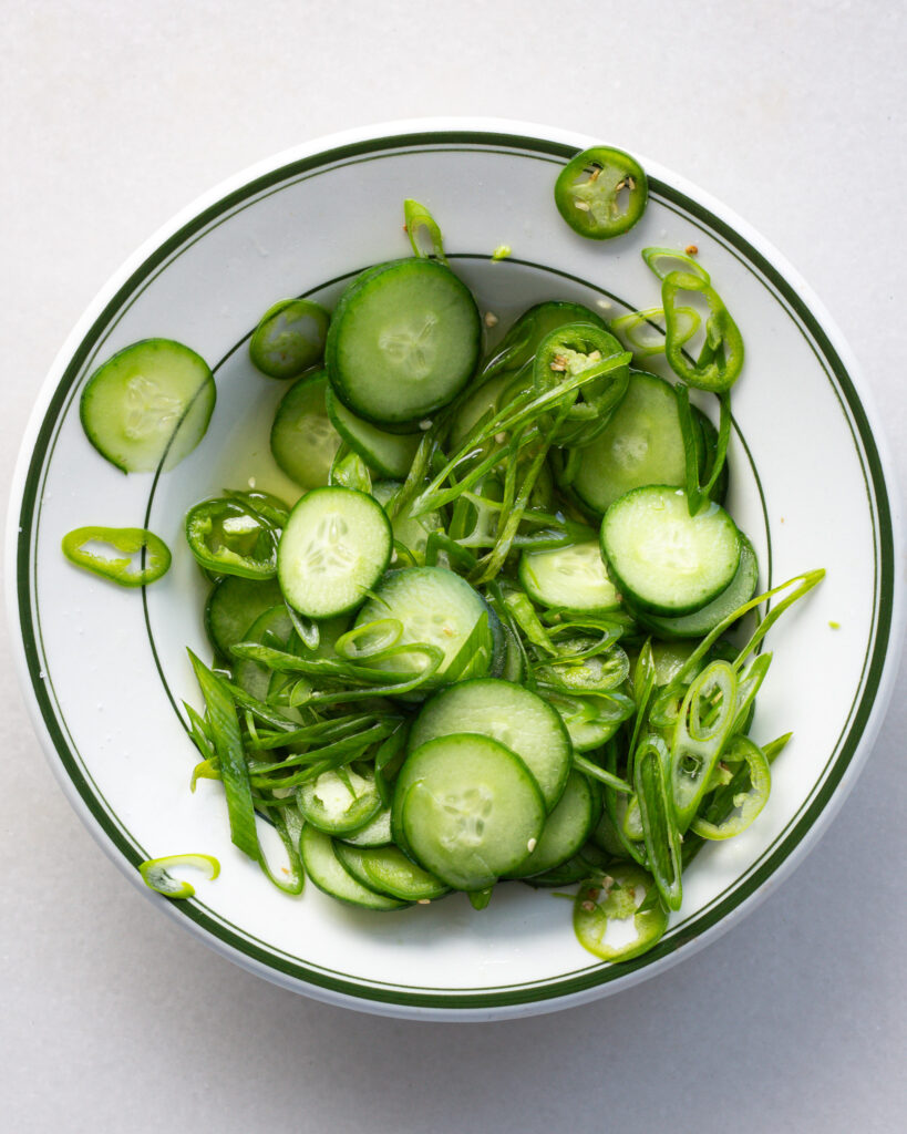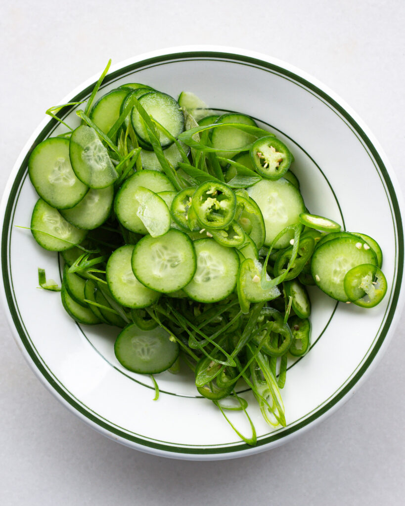 To quickly bring the salad together, just thinly slice the cucumber, serrano pepper and scallion greens and add them to a bowl. Season with the rice vinegar and a pinch of salt. Mix and set in the fridge.