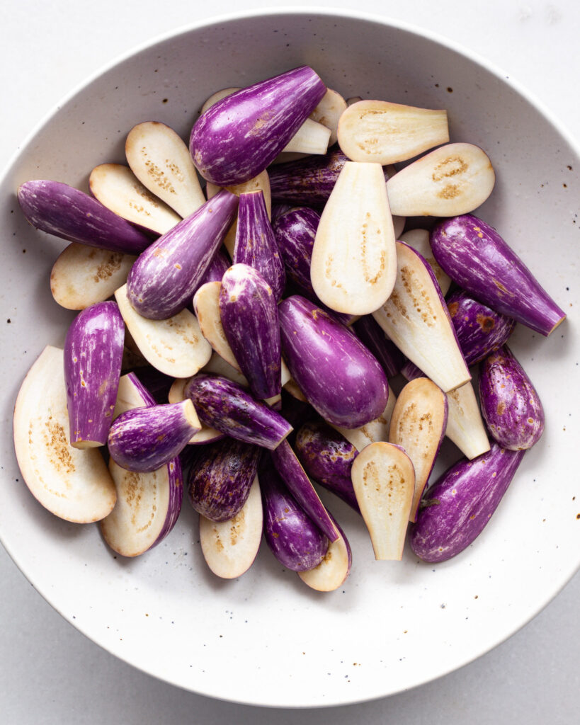 - While the tofu is being pressed, halve the fairytale eggplants and set them aside.