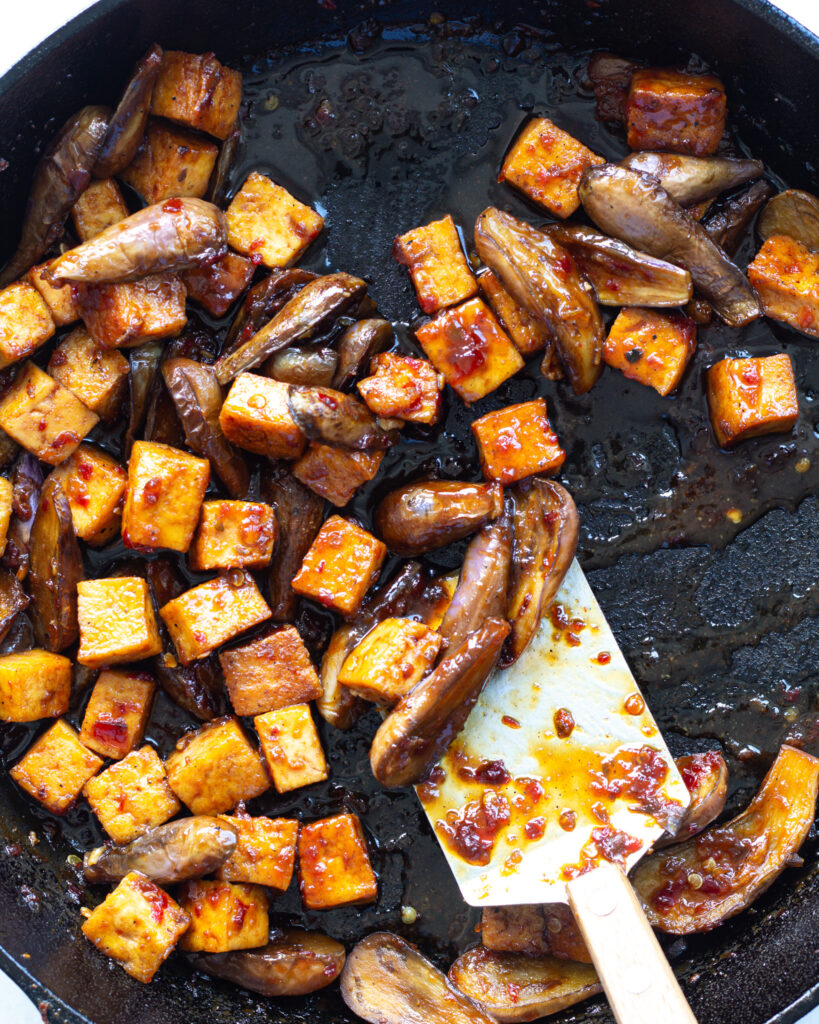 Add the tofu back in with the eggplant, then pour in the sauce. Stir to coat. The sauce will be thin, but let it simmer and reduce for 7-8 minutes, stirring occasionally.
