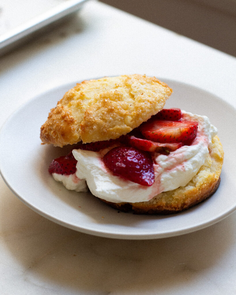 Shortcake dough is a fun little ratio, 2 cups flour, 1 cup buttermilk, 1/2 cup butter. After you have that memorized, all the other elements are just details! Here is everything you make to make this super-simple shortcake: