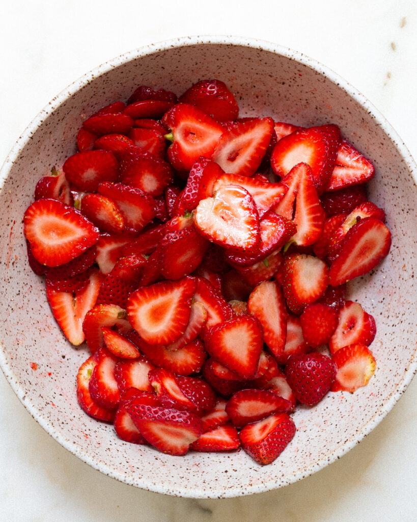 From there, it’s all about piling on the strawberries! Sometimes strawberries in sugar leave a bit of their juices at the bottom of the bowl, so I like to scoop that up too and drizzle it on top.