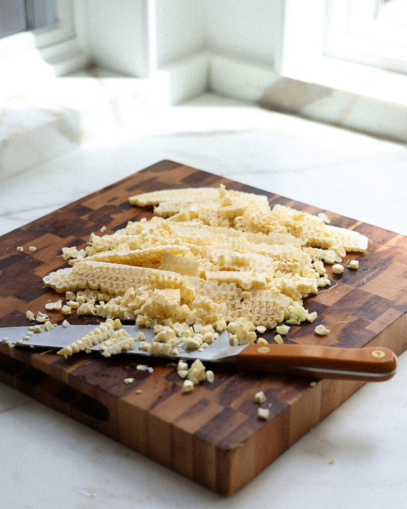 I suggest making this with raw corn when it’s at its peak, but frozen corn would be completely fine, too. We want to have the corn raw, though. It will cook along with the pancakes, which lets their texture and sweetness turn out perfectly.
