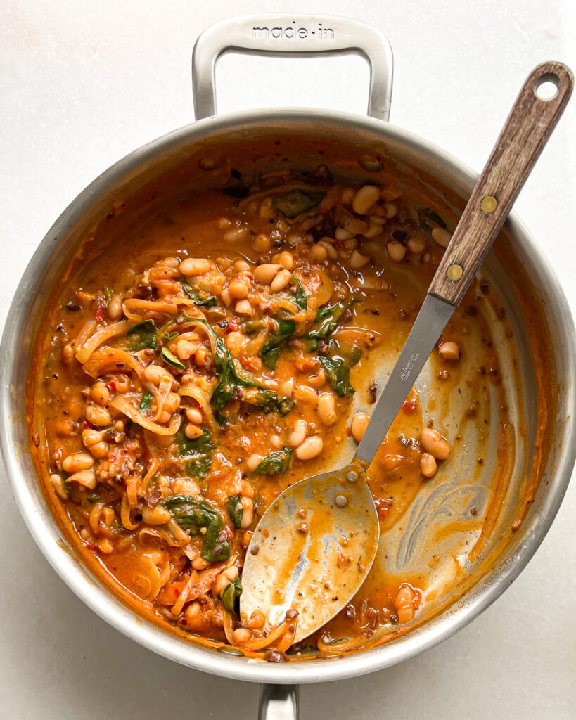 - Lastly, toss in the spinach and give it a stir. It will wilt into the beans in seconds.