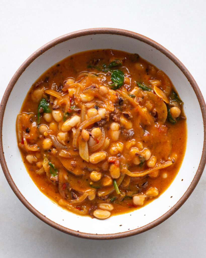 These spicy and sweet potato beans are my current brothy bean fixation, and that’s saying something, because I have a lot of brothy bean fixations. But these are just so unique and so good. They are incredibly easy to make, and using canned beans means you can whip these up in no time. The sweetness from an easy sweet potato “broth” (see the blog post below for more details) plays so perfectly with the spiciness of the chili in the beans, and the salty hit from the kalamata olives. If you’re an olive person, or a spice person, or even just a bean queen, these simple sweet potato beans have something going on for you.