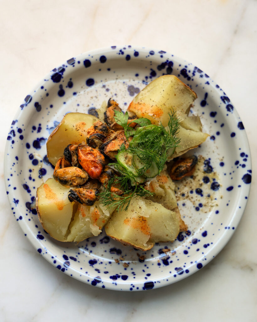 I know, I know, we are all trying to find ways to eat our tinned fish, but sometimes alone on toast with a pickly salad and kewpie mayo is the way! Until you get bored of that, and that is when I would like to introduce you to these Tinned Fish Jacket Potatoes. A salty baked potato that roasts in the oven while the tinned fish warms alongside it, bubbling in its oil. From there, add a bright salad and a bit of Greek yogurt, and lunch is set.