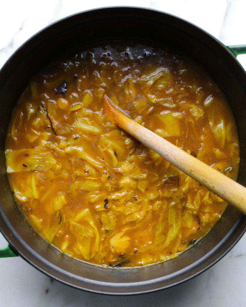 In the depths of winter, not much is in season. But somehow every trip to the farmers’ market has exactly what I need for this stew: mushrooms (always in season, thank you fungi), onion, and cabbage. These ingredients are humble, but WOW do they deliver in this Caramelized Mushroom and Turmeric Stew. A stew that builds flavor from charred and darkened mushrooms, quickly frizzled onions, and cabbage that becomes so silky through a bit of simmering.