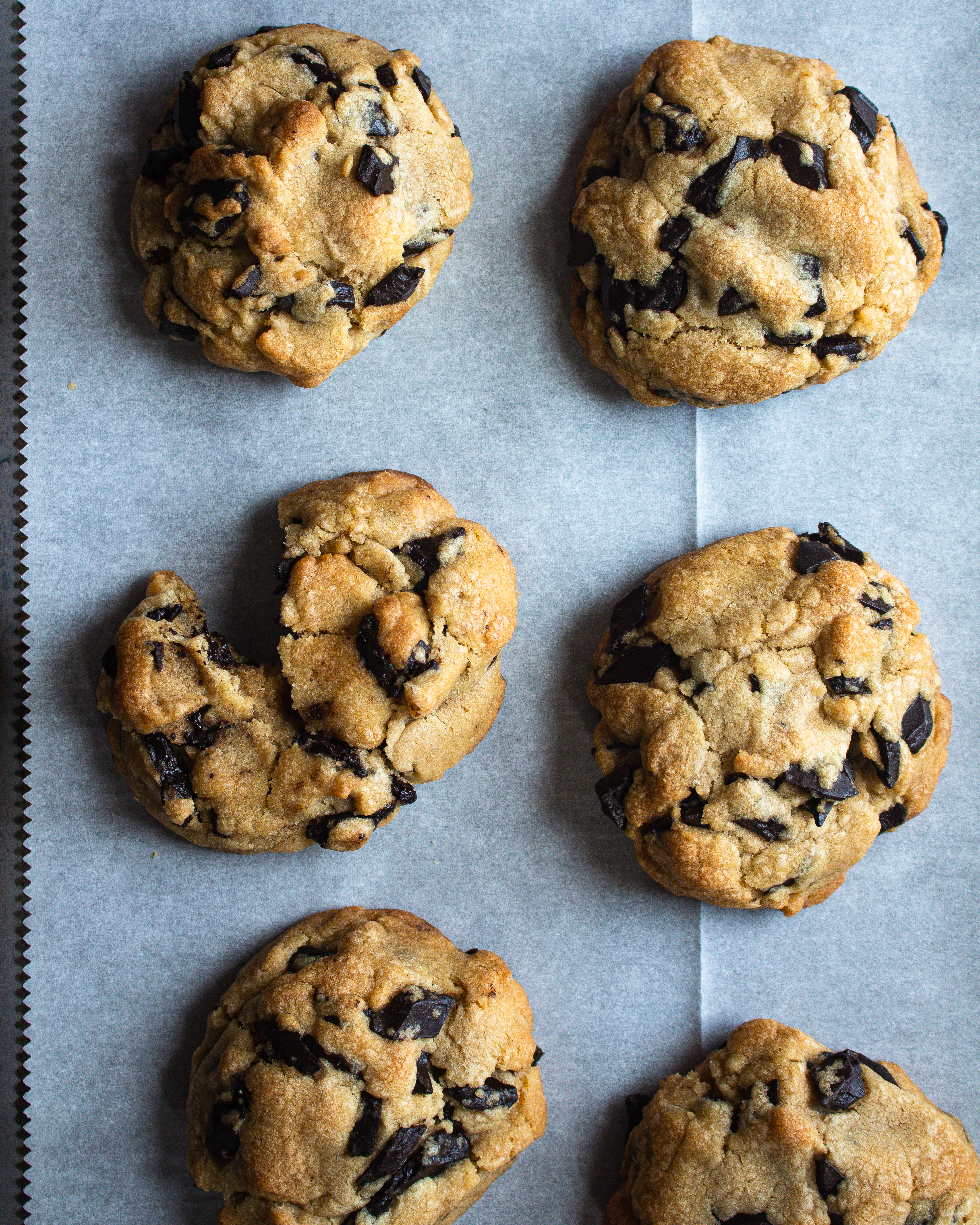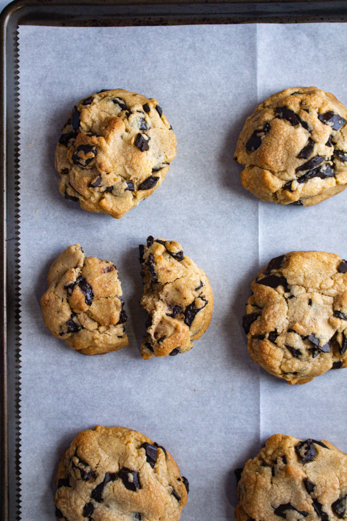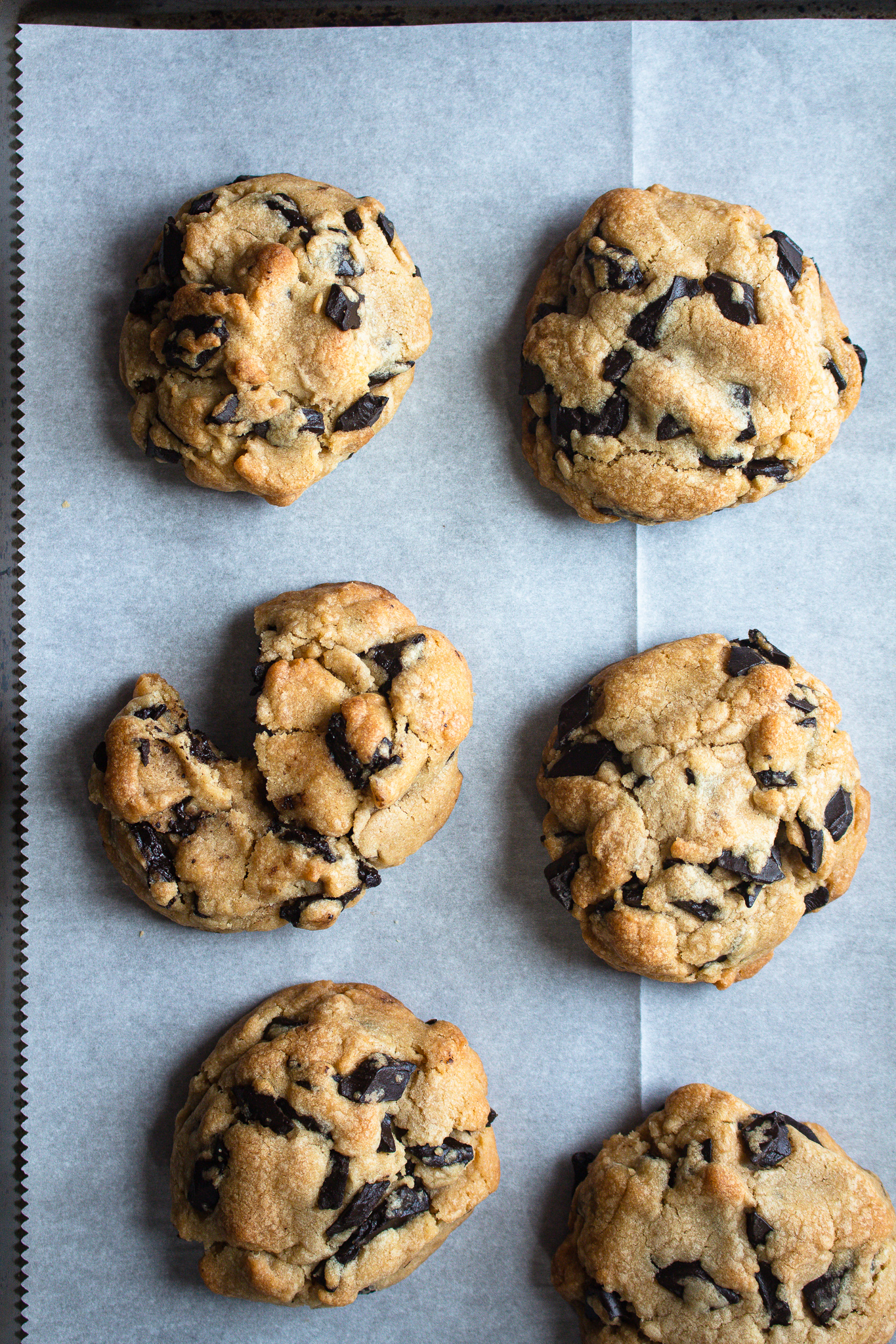 This is because of a few factors – vegetable shortening has a higher melt point than butter, meaning that it needs to be in the oven longer before it gets to that spread point that butter has. You know when you put a tall cookie dough mound in the oven and you check back and it’s a puddle? That almost never happens when using vegetable shortening. The shortening helps the cookies maintain their height while they bake throughout, making a moist, gooey, tall and tender cookie. Just like the ones at Levain!