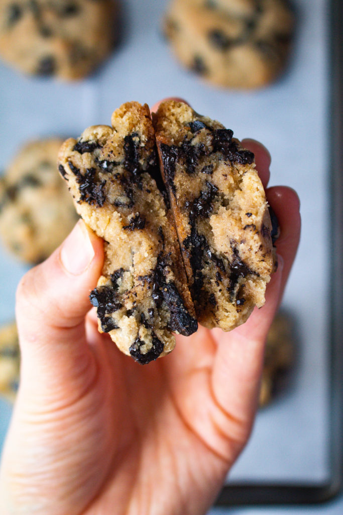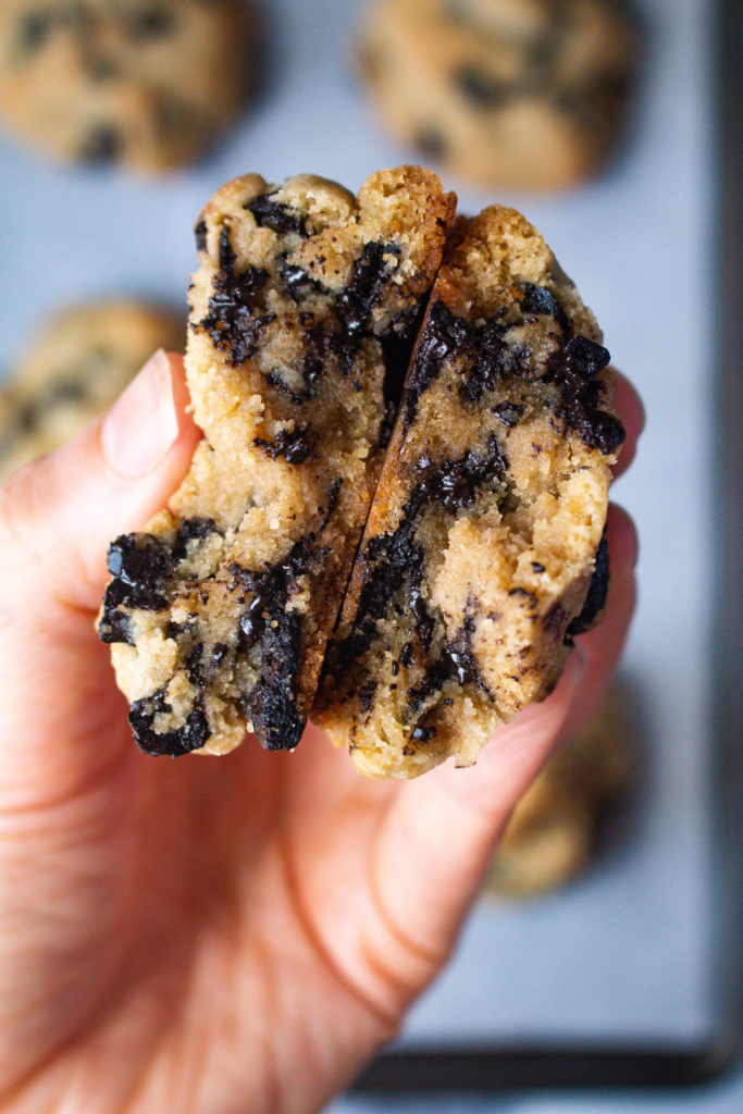 I have another (non-vegan) Levain cookie recipe, but that takes a little more technicality and skill, whereas this recipe I can just throw together and boom: Levain cookie. And that’s all because of one magic ingredient: vegetable shortening!