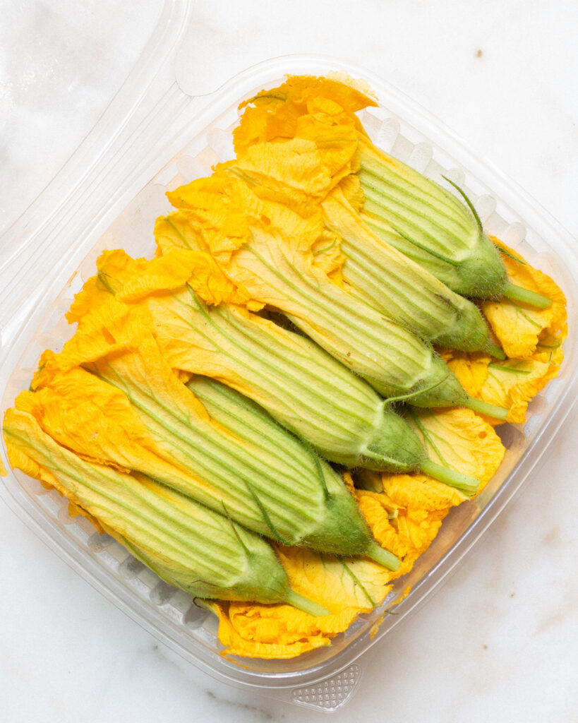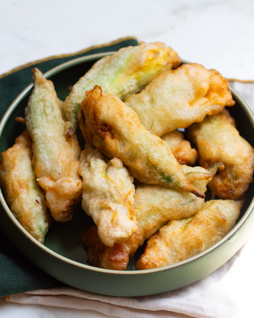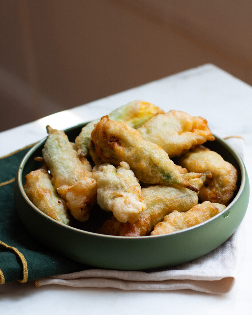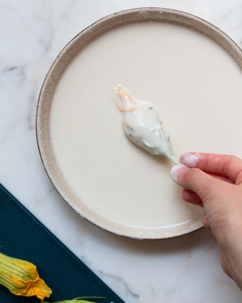 Now I do need to caveat: there is nothing wrong with the original version, this just happens to be my preferred version! Plus, I love how it makes this squash blossom recipe accessible to all diets, too. I’m still working on how to make a gluten-free version, but for right now I’ve found rice flour is a pretty solid substitute!
