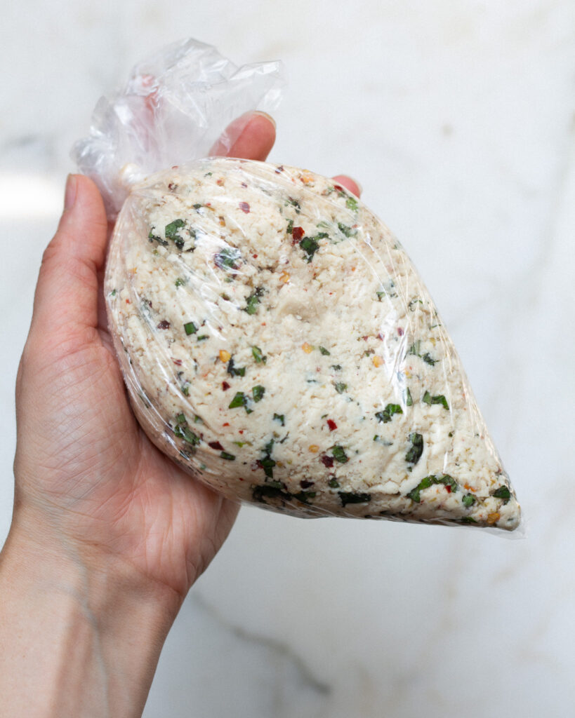 Once the tofu is in the bag, I don’t seal the end. If you do, air gets trapped in there and it turns into a not-fun disaster. I just loosely roll it closed.