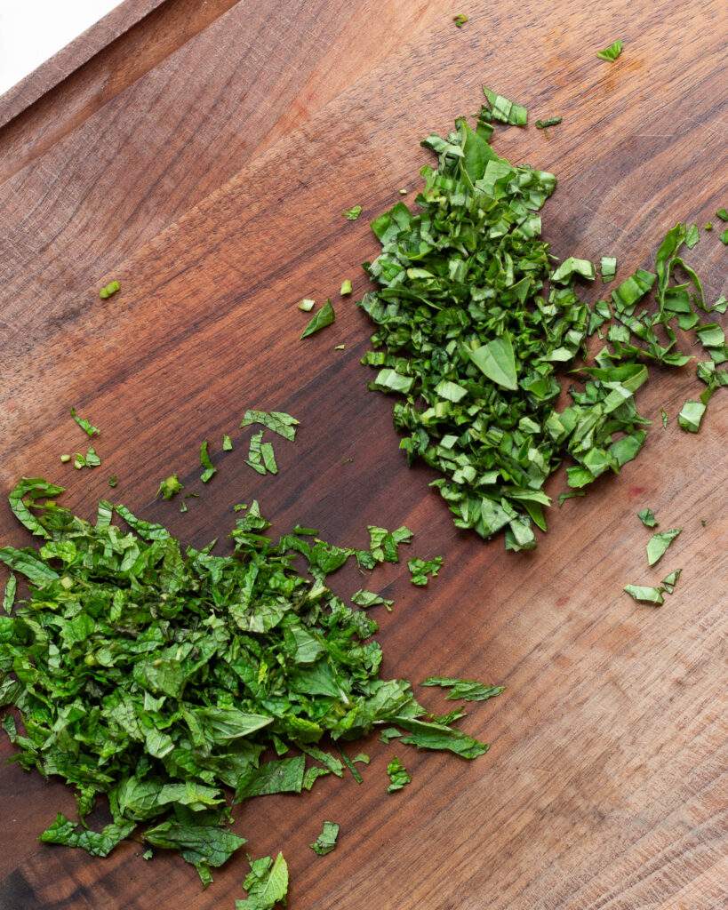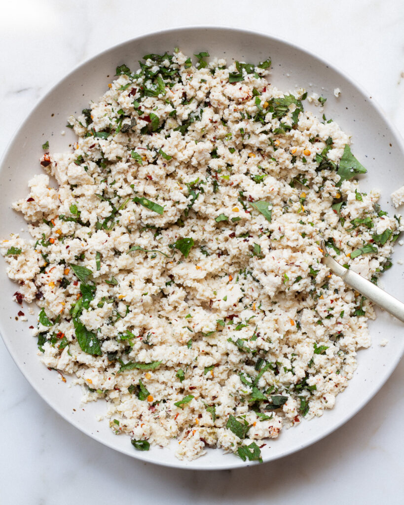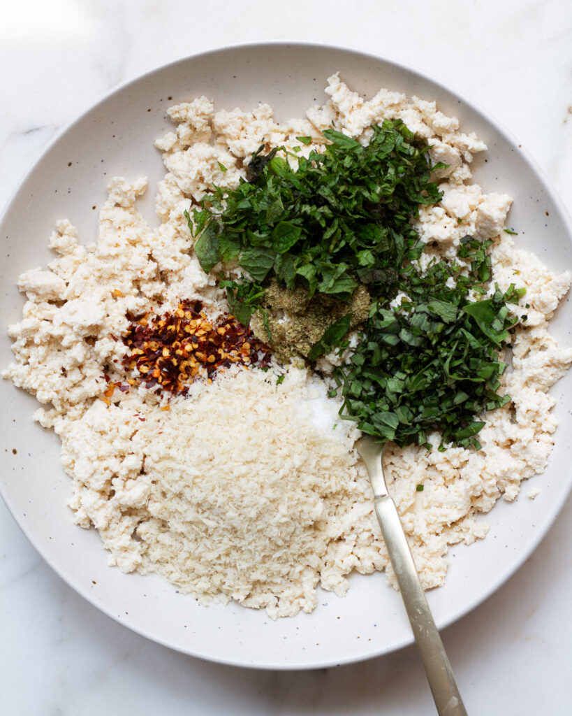 - Finely chop the mint and basil and add it to the tofu. Add the 1/4 cup of bread crumbs, 1 teaspoon oregano, 1 teaspoon red pepper flakes and 1 teaspoon salt and mix to combine. The mixture may be crumbly, but don't mind it.