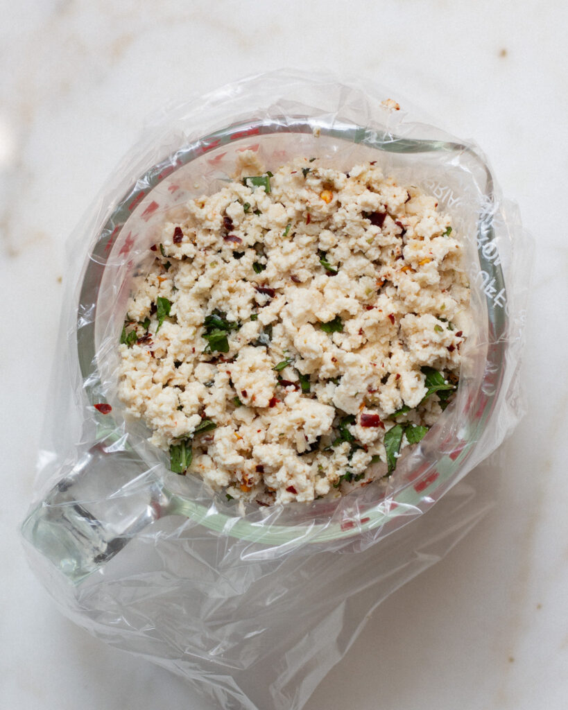 The tofu also includes oregano, red pepper flakes, and salt, because the more flavor we can get in the tofu blend, the better the vegan stuffed squash blossoms will be.