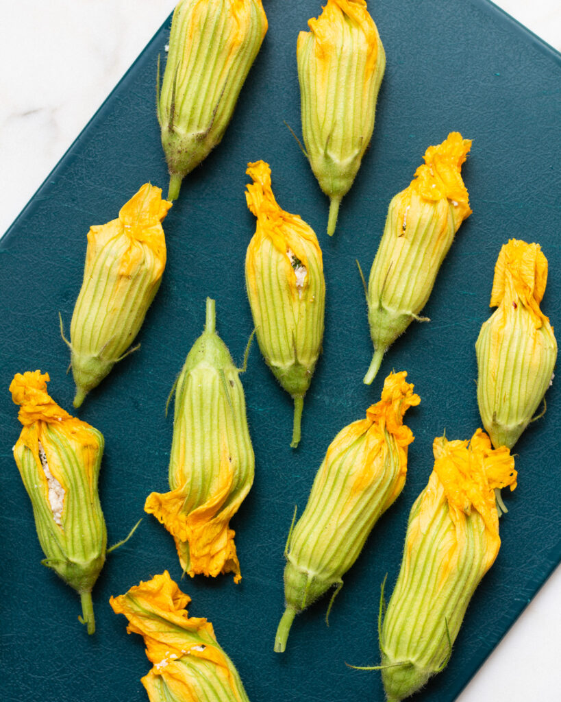 - Place all the stuffed blossoms on a cutting board and set them aside.