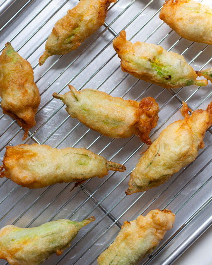 The squash blossoms only need a light coating and a quick fry to make them delicious. Which is also great, because then you aren’t eating some crazy amount of double-fried food! It’s just a quick dip, a one minute fry, and then it crisps up on a cooling rack.