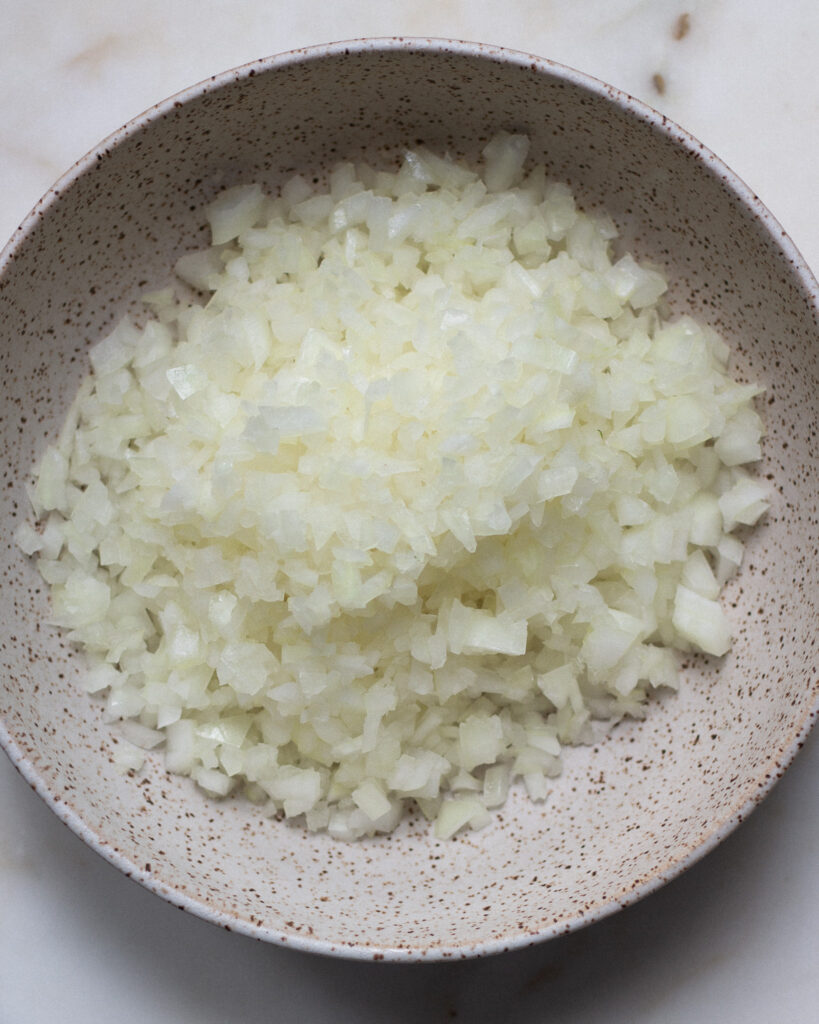- Finely dice the yellow onion and set it aside.