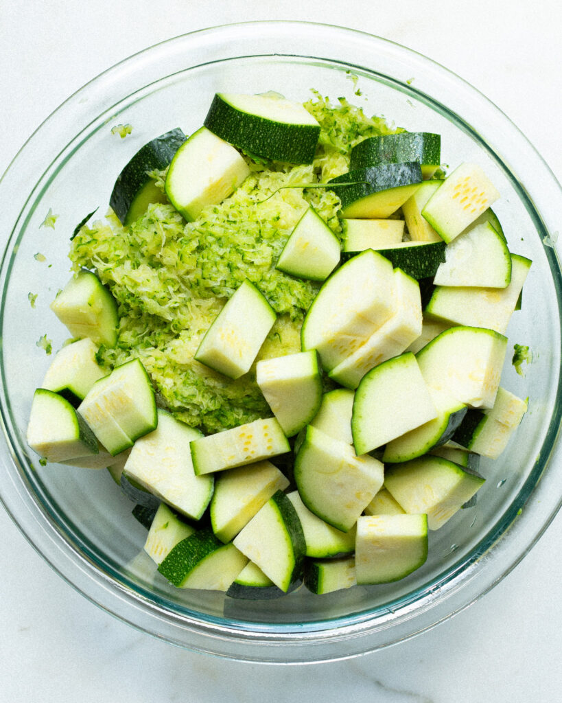 - Begin with the mise en place. Quarter one zucchini lengthwise, then slice it crosswise into bite-sized pieces. Use a rasp-style grated to grate the remaining two zucchini. Add this all to a large bowl and set aside.